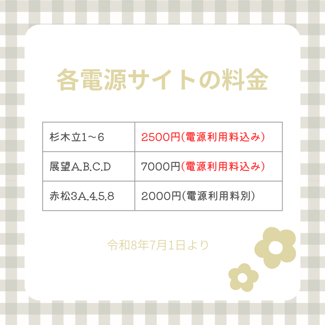 このたび料金体系をわかりやすくするため、杉木立サイトの料金を下記の通り変更させていただくことになりました。